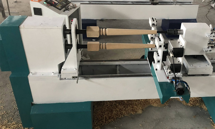 1516 Cnc Wood Lathe machine with double axis is also called multi-function two-axis CNC woodworking lathe. It has the functions of round shape cutting, milling groove, hollowing, engraving, etc. It can process two workpieces at one time, and the product efficiency is improved.The two-axis lathe-milling and engraving machine controls the running track of different turning tools with the numerical control system. It only needs to input the shape and size of the product into the numerical control system without changing the lathe Knives, no need for frequent debugging, automatic processing of wood according to design drawings, more suitable for manufacturers of stairs, furniture fittings, tables and chairs legs.